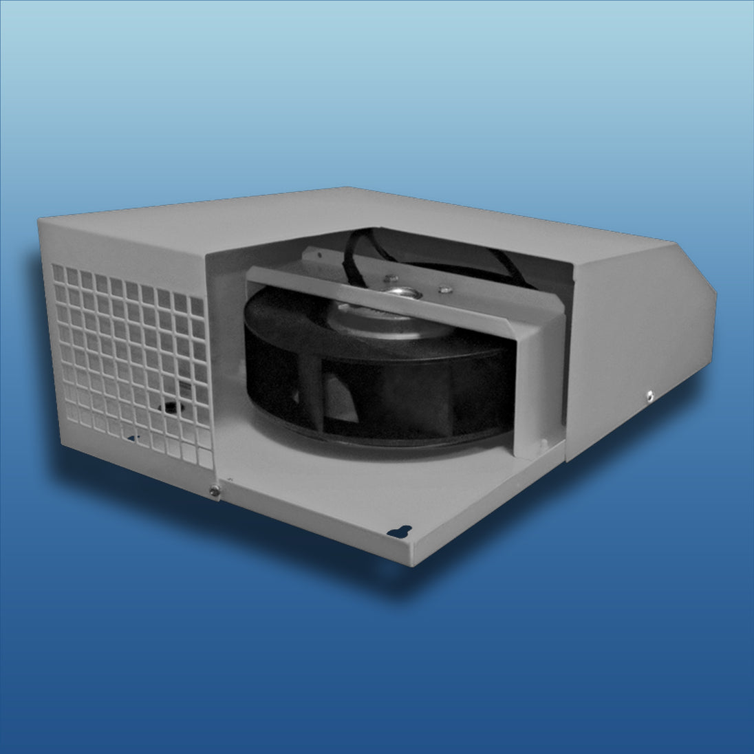 Das Gehäuse ist aus lackiertem Stahl. Die Unterseite der Haube ist mit einem Gitter gegen Vögel und Nagetiere versehen. Die Luft Strömt vertikal nach unten weg.